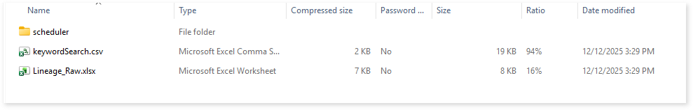 keywordSearch.csv: Provides detailed insights into keyword occurrences— specifically jobs and boxes—identified across all uploaded source files. It captures information such as the search type, the file where the keyword was found, the line number of occurrence, and the actual line content where the keyword appears.