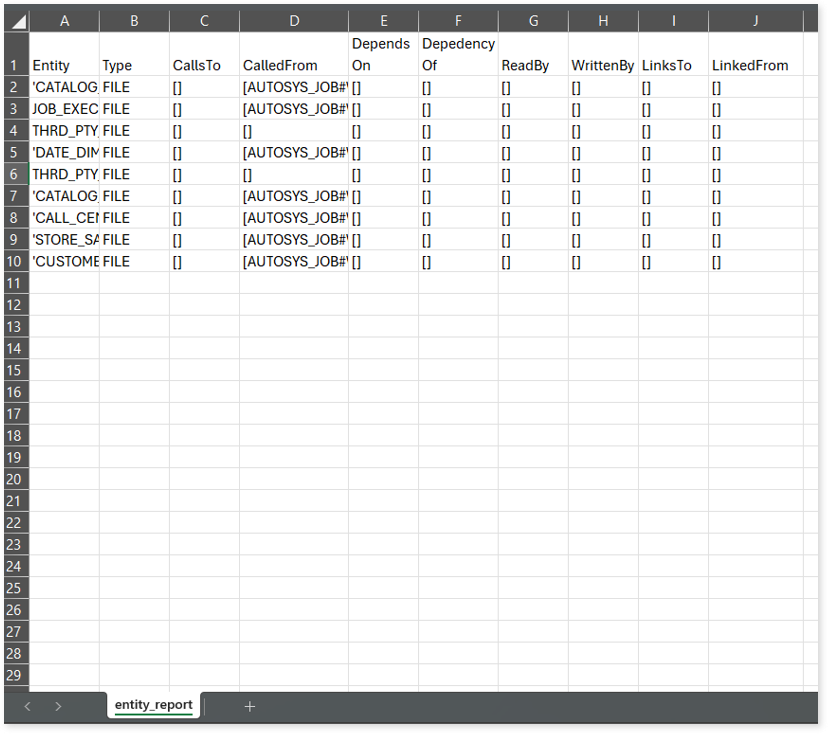 entity_summary.csv: This report provides a list of entities from uploaded source files, indicating where they appear (e.g., Autosys jobs and Autosys boxes) and the operations performed on them—Read, Write, or ReadWrite.