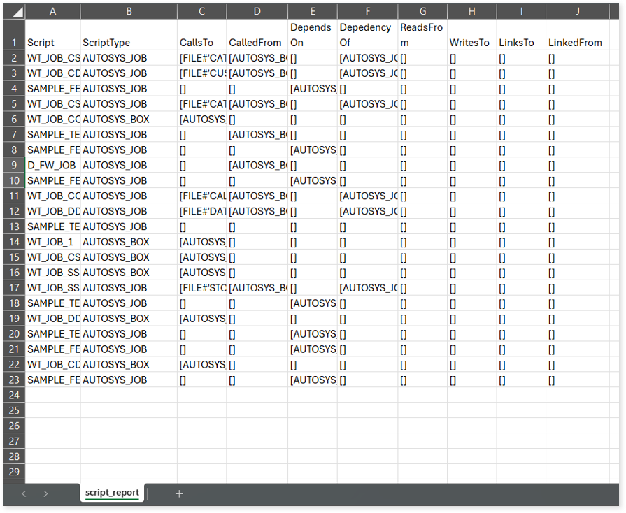 script_report.csv: This report provides detailed lineage information for each script. It lists all scripts along with their type, specifies the processes, jobs, or scripts from which each script reads data and those to which it writes, as well as other dependency details.