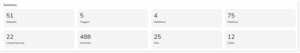 - Volumetric Info: Presents a summary of the aggregated inventory after analyzing the source files. For instance, it provides total number of pipelines, linked services, datasets, triggers, procedures, activities, and more.