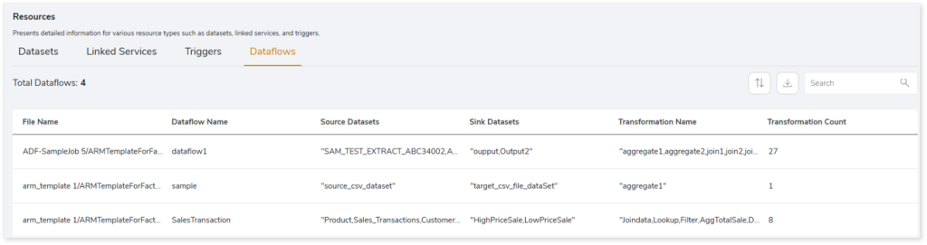 - Dataflows: Displays the number of data flows present in the source files. In ADF, data flow is used to visually design and perform complex data transformations within pipelines.