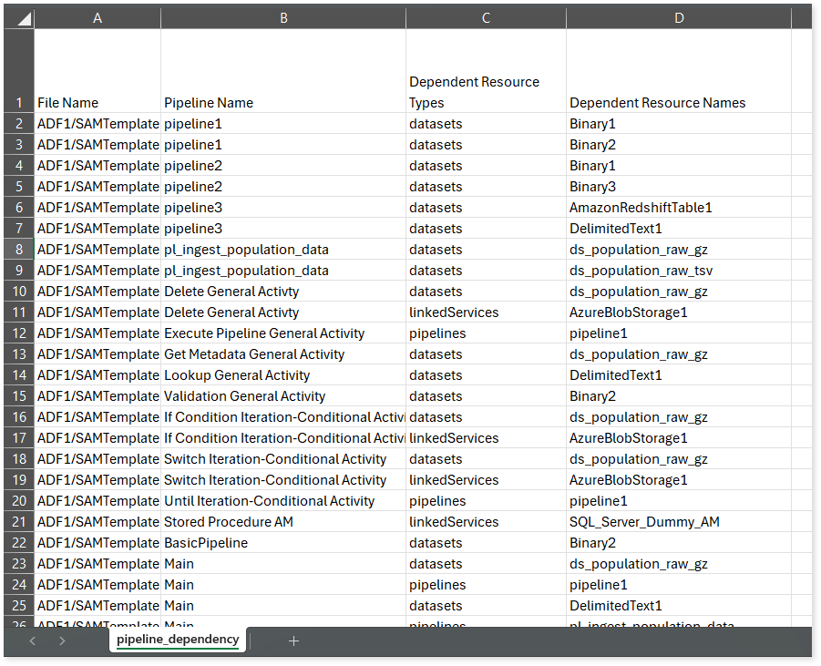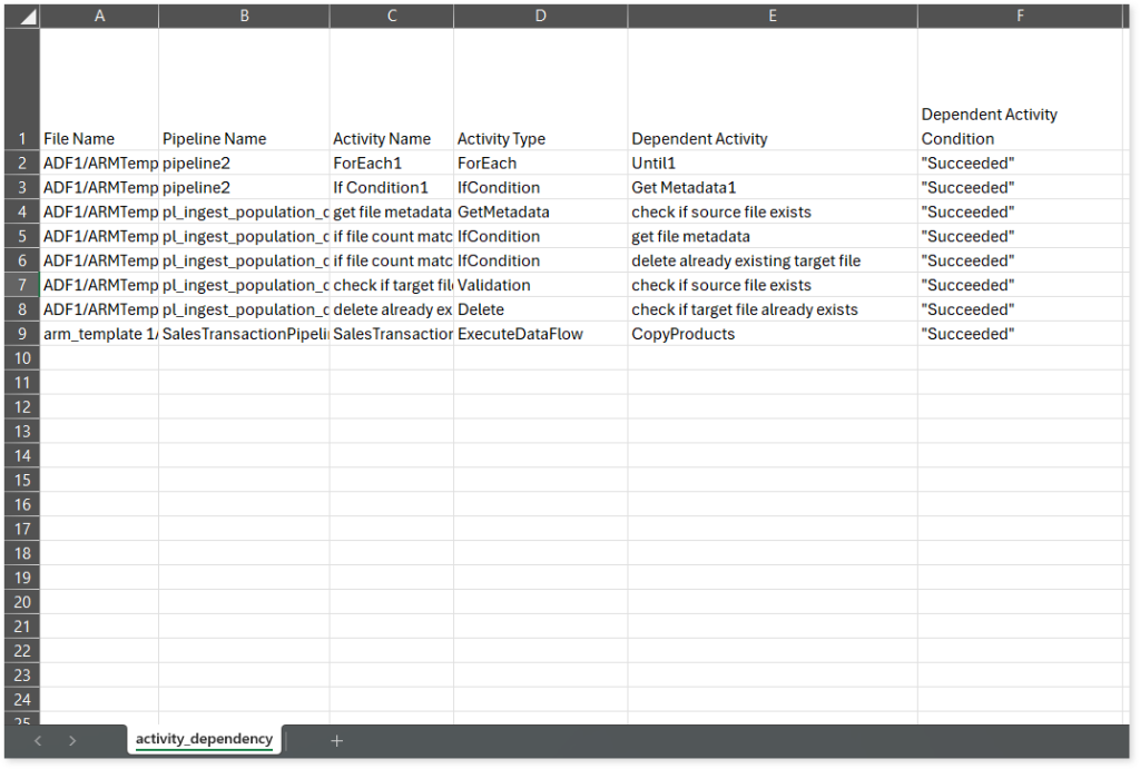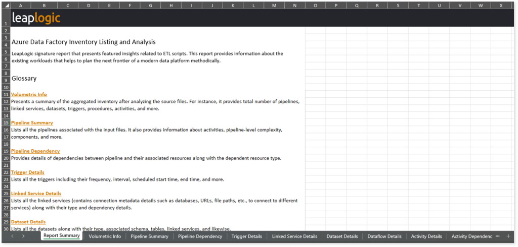 ADF Assessment Report.xlsx: This report provides insights about the source inventory. It includes information about the source inventory and pipelines.