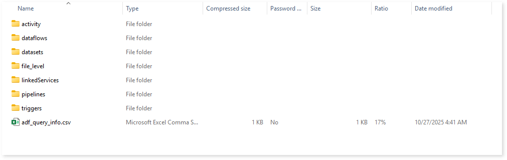 It is an intermediate report which helps to debug failures or calculate the final report. It includes all the generated CSV reports. Here, you can view the folders—activity, dataflows, datasets, file_level, linkedServices, pipelines, and triggers—along with the adf_query_info.csv report.