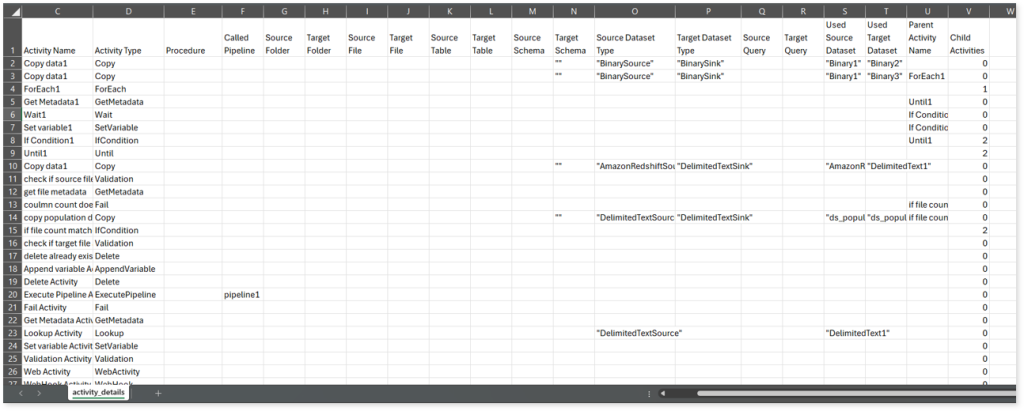 activity_details.csv reports: This report provides detailed information about activities, including their type, procedure, called pipeline, source and target folders, tables, and more.