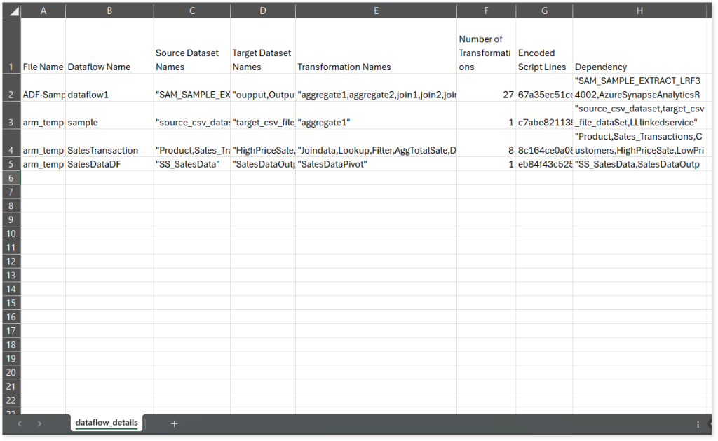 dataflow_details.csv: This report provides detailed information about data flows, including their source and target datasets, transformations, dependencies, and other related data.