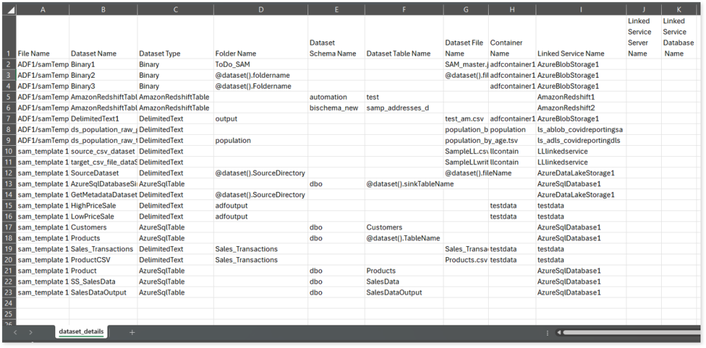 dataset_details.csv: This report provides detailed information about datasets, including type, container, linked service, and more.