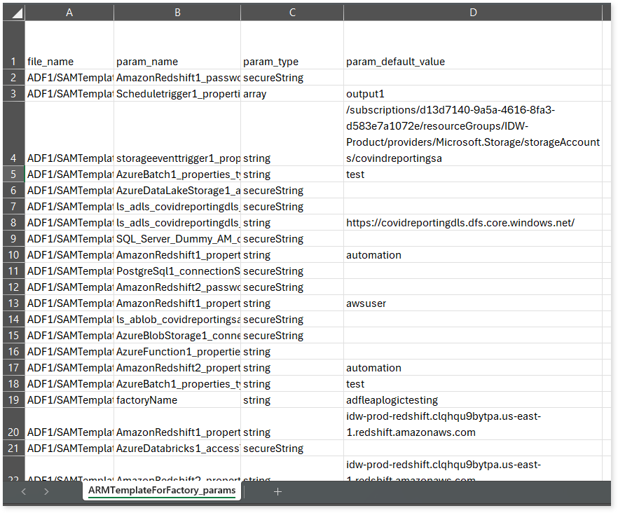 ARMTemplateForFactory_params.csv: This report provides detailed information about parameters, including their type and default value
