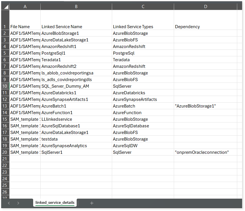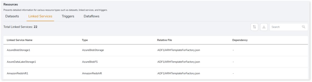 - Linked Service Details: Lists all the linked services (contains connection metadata details such as databases, URLs, file paths, etc., to connect to different services) along with their type and dependency details.