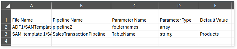 Pipeline Parameter.csv: This report provides detailed information about parameters used in the pipeline, including their type and default value.