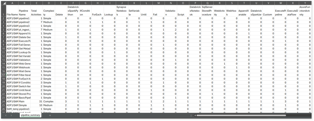 pipeline_summary.csv: This report provides detailed information about pipelines, including the total number of activities, their complexity, and the types of activities used, such as Delete, DatabricksSparkPython, IfCondition, ForEach, and more.