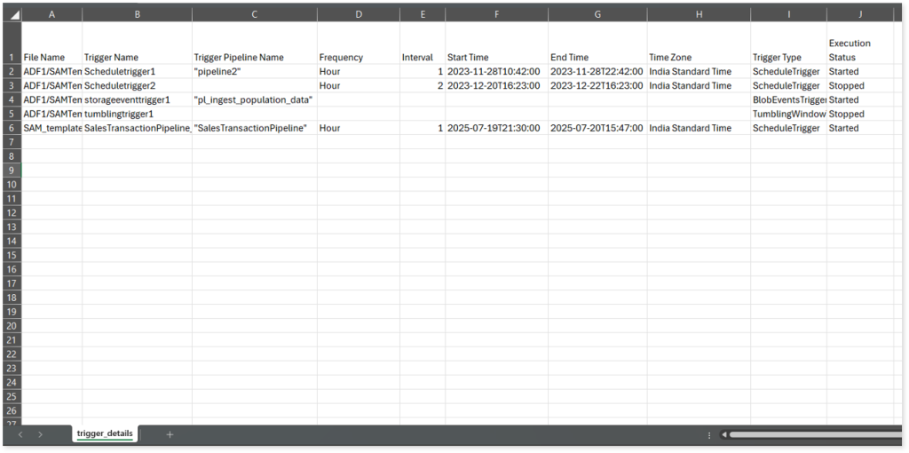 - Trigger Details: Lists all the triggers including their frequency, interval, scheduled start time, end time, and more.
