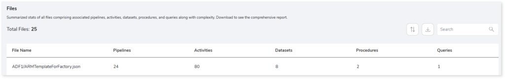 This section provides a comprehensive report of the source files along with information about the total number of files, pipelines, activities, datasets, and so on.