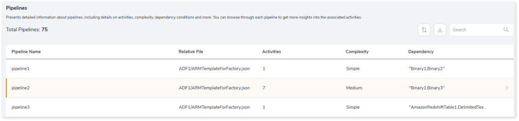 - Pipeline Summary: Lists all the pipelines associated with the input files. It also provides information about activities, pipeline-level complexity, components, and more.