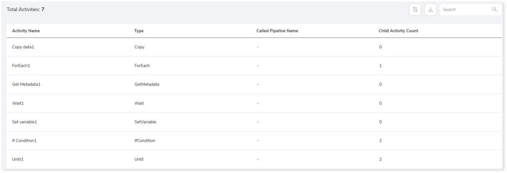 - Activities: Displays the number of activities in the source files. Each pipeline can contain multiple activities. Activities are primary components that specify actions such as validating data, deleting data, obtaining metadata, etc.