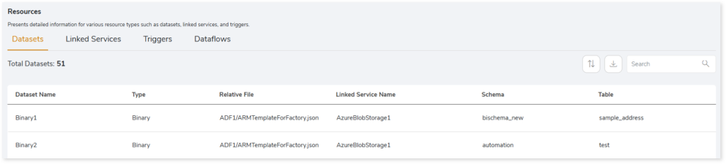 - Dataset Details: Lists all the datasets along with their type, associated schema, tables, linked services, and likewise.