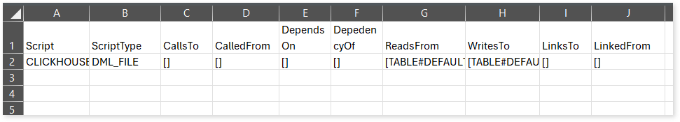 script_report.csv: This report provides detailed lineage information for each script. It lists all scripts along with their type, specifies the processes, entities, or scripts from which each script reads data and those to which it writes, as well as other dependency details.