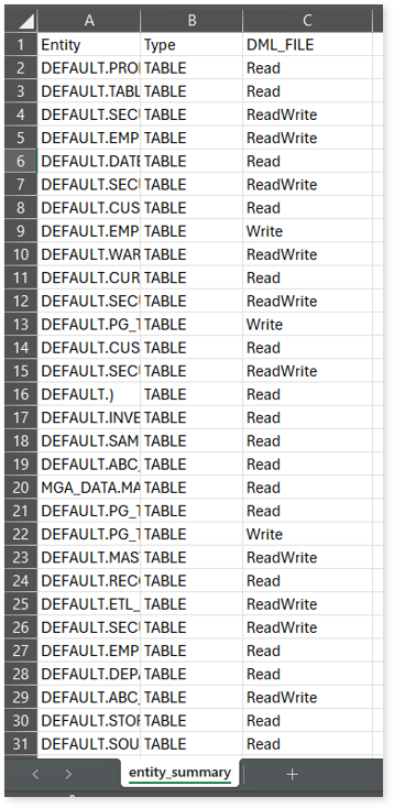 entity_summary.csv: This report provides a list of entities from uploaded source files, indicating where they appear (e.g., DML files) and the operations performed on them—Read, Write, or ReadWrite.