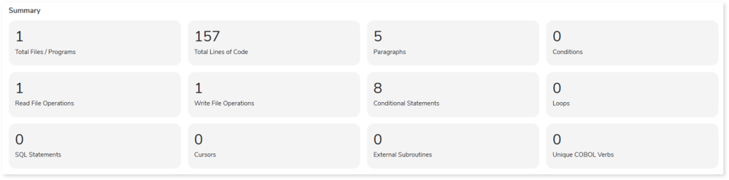 This section presents an overview of the input files and the associated workload inventory. It includes details such as the total number of files, lines of code, paragraphs, conditions, file operations, and other key elements identified during analysis.