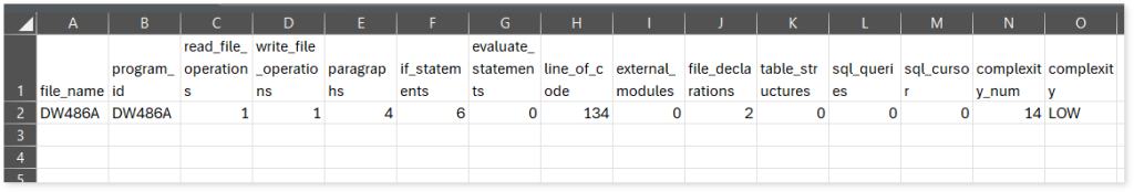 The downloaded archive includes the Cobol_Analysis.csv file, which provides information about each file, including the associated program ID, number of read and write file operations, lines of code, table structures, complexity, and more.