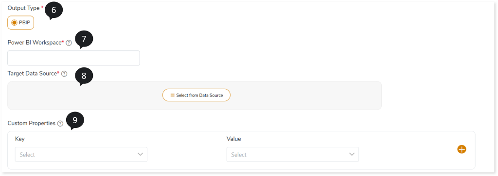 - In Output Type, select PBIP as the output type format for the generated artifacts.