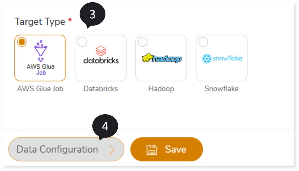 - If the selected target is Spark, click Data Configuration to proceed. For other targets, click Save.