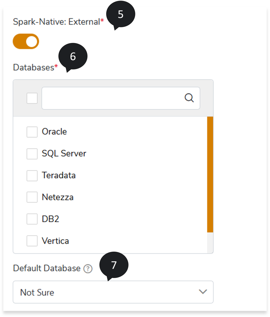 - Enable Spark-Native: External toggle to fetch input data from an external source such as Oracle, Netezza, Teradata, etc., and process that data in Spark, and then move the processed or output data to an external target. For instance, if the source input file contains data from any external source like Oracle, you need to select Oracle as the Databases to establish the database connection and load the input data. Then data is processed in Spark, and finally the processed or output data gets stored at an external target (Oracle). However, if you select Oracle as the Databases but the source input file contains data from an external source other than Oracle, such as Teradata, then by default, it will run on Spark.