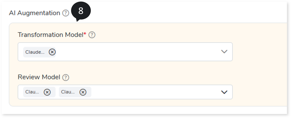 - In AI Augmentation, select the preferred Transformation and Review models to convert queries that require augmented transformation and perform syntax validation for accuracy and optimal performance. To convert queries using AI Augmentation, you must provide the source and target combinations in the Add New Sources and Targets page (Governance > Intelligence Modernization > Custom/ Source/ Target > Add New Sources and Targets)