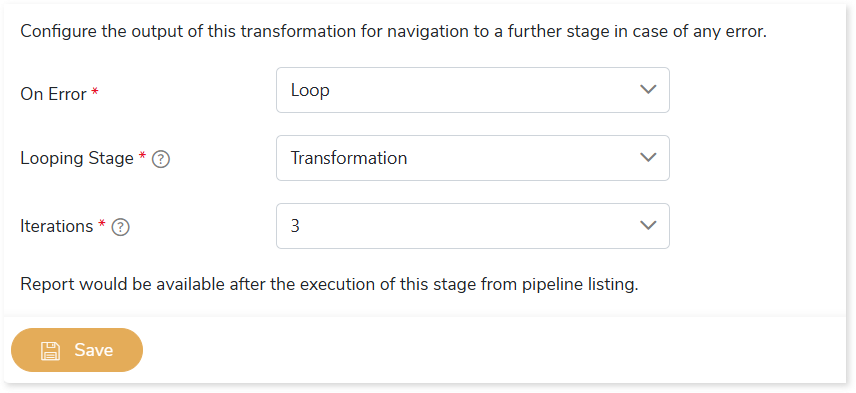 You can configure the output behavior for navigation to the next stage when an error occurs. By default, the output configuration is set to Error if the stage is less than 100% complete, but you can change this to Continue, Stop, Pause, or Loop as required.