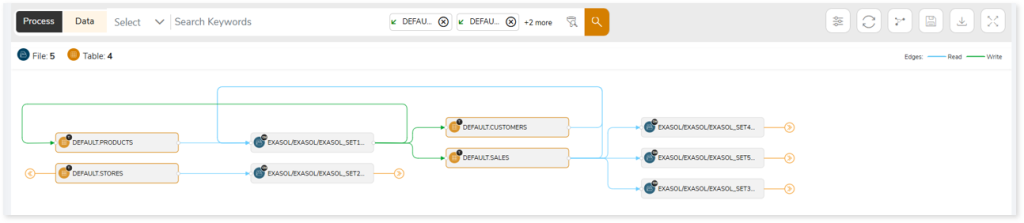 - Process lineage illustrates the dependencies between two or more processes such as files, views, tables, etc.