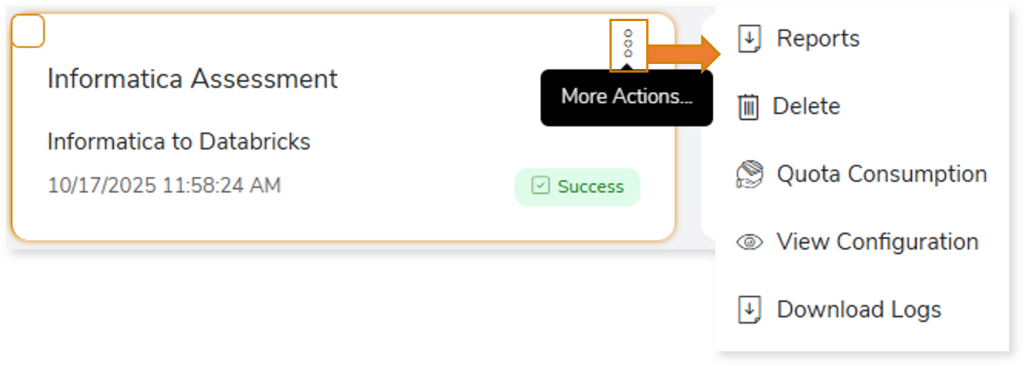 Assessment listing page lists all the executed assessments. Here, you can view and access all the executed assessments to gain more insights about the source inventory. Moreover, it allows you to create new assessments and also provides valuable information regarding the anticipated quota deduction when executing transformation pipelines or notebooks of executed assessments.