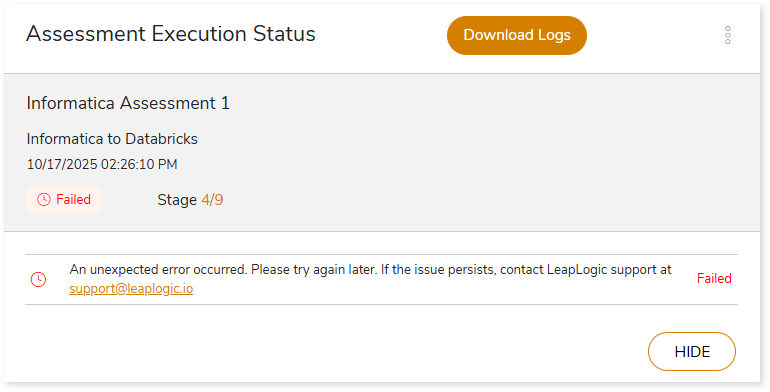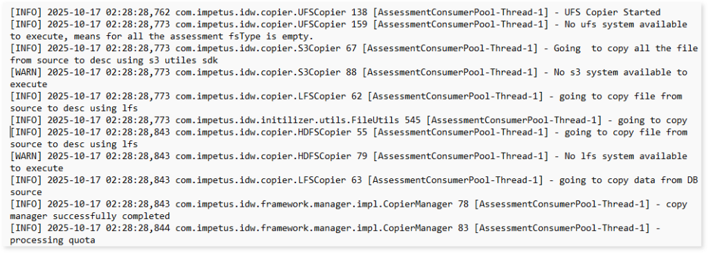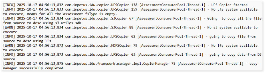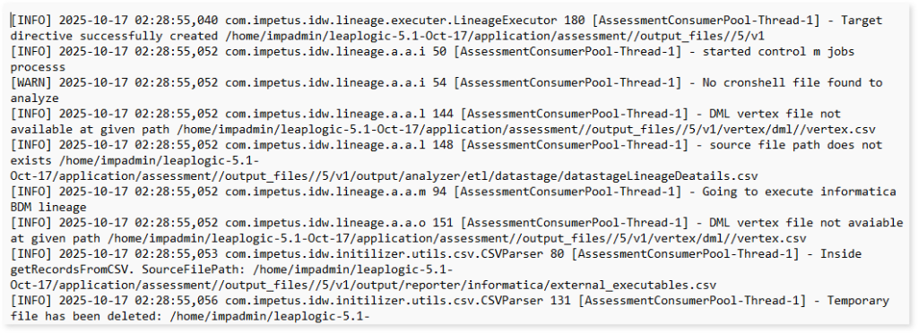 - Lineage Log: Captures detailed runtime information related to the lineage analysis during assessment execution. It helps you understand the flow of lineage operations and identify any missing components or skipped steps.