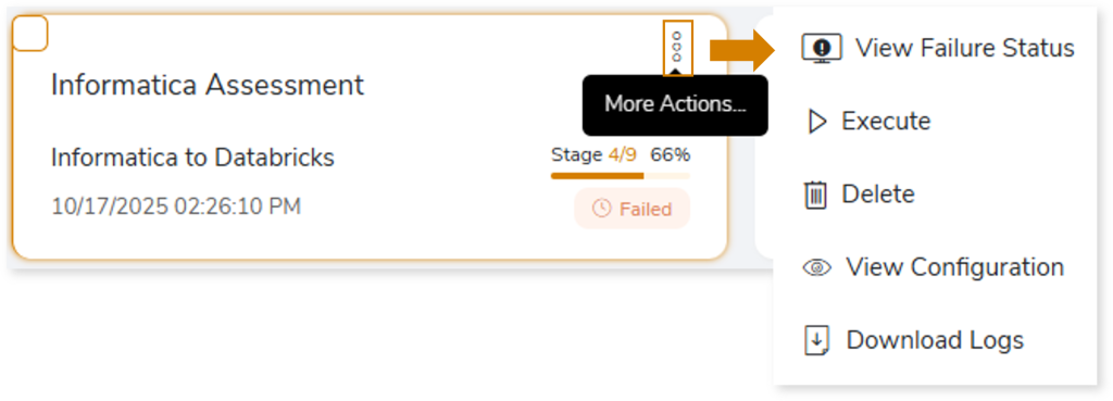 - View Failure Status: Opens the Assessment Execution Status dialog, where you can view a detailed message explaining the error or the reason for failure.