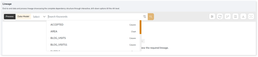 - Select either the Process or Data Model tab to enable process or data model lineage respectively.