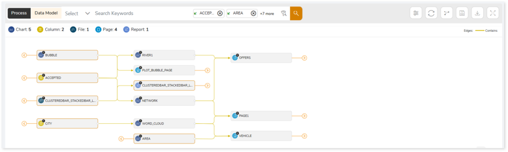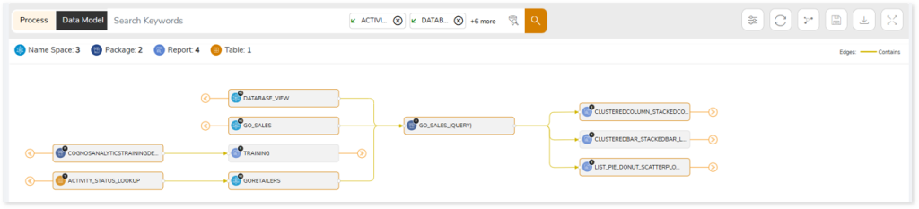 In addition, the filter search icon allows you to include or exclude particular nodes to obtain the required dependency structure. It helps you quickly narrow down complex dependency graphs to focus on the exact nodes, relationships, or data flows you want to analyze. Instead of navigating through an entire lineage network, you can apply filters based on object names, types, or relationship categories—making it easier to isolate specific tables, workflows, or transformation paths. This feature enhances traceability, reduces visual clutter, and enables you to precisely identify upstream or downstream dependencies that are most relevant to your analysis or migration scope.