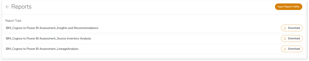 Downloadable reports allow you to export detailed IBM Cognos assessment reports of your source data which enables you to gain in-depth insights with ease. To access these assessment reports, click Reports.