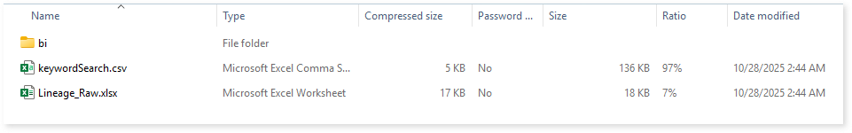 It is an intermediate report which helps to debug failures or calculate the final report. It includes all the generated CSV reports. This folder contains a bi folder along with the keywordSearch.csv and Lineage_Raw.xlsx reports.