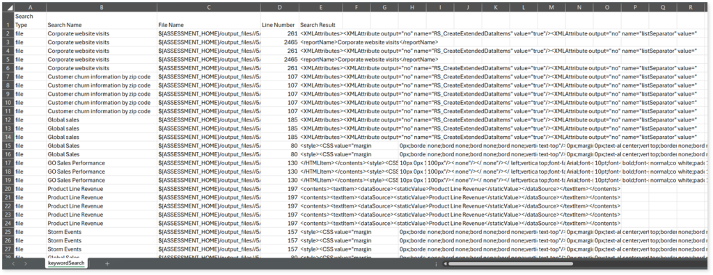 keywordSearch.csv: This report provides information about all the identified files using the file keyword search across uploaded source files. It includes details such as the search type, the file that contains the search keyword, the line number where it occurs, and other related information for each keyword.