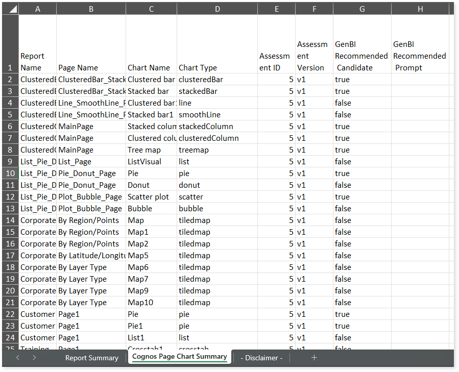 - Cognos Page Chart Summary: Lists all the pages available in reports along with details such as chart names, chart types, recommended candidates for conversational interface, and more.