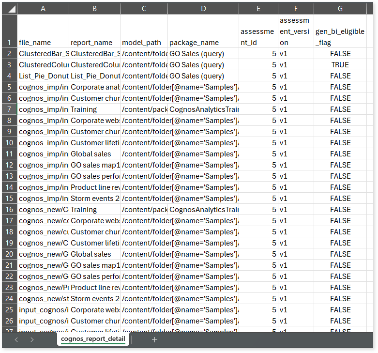 Cognos Assessment Report.xlsx: This report provides insights about the source inventory. It helps you plan the next frontier of a modern data platform methodically. It includes information about reports, pages, namespaces, and more.