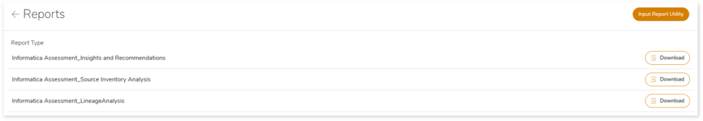 Informatica Assessment.xlsx: This report provides insights about the source inventory. It helps you plan the next frontier of a modern data platform methodically. It includes a report summary, aggregated inventory, transformations, workflows, mappings, and more.