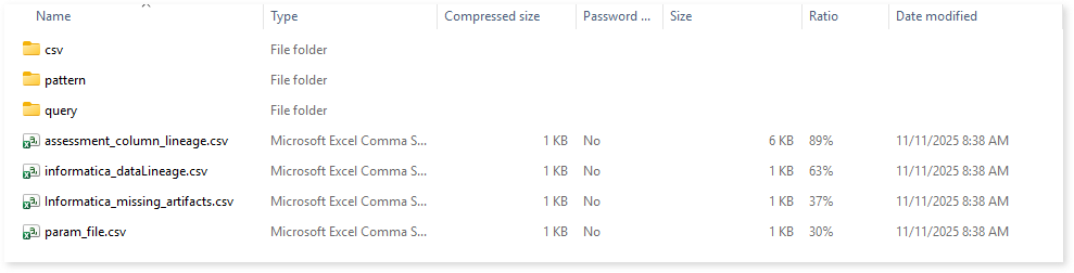 To access other assessment reports, open the informatica folder. Here, you can see CSV, pattern, and query folders along with assessment_column_lineage.csv, informatica_data lineage, informatica_missing artifacts, and param_file.csv reports.