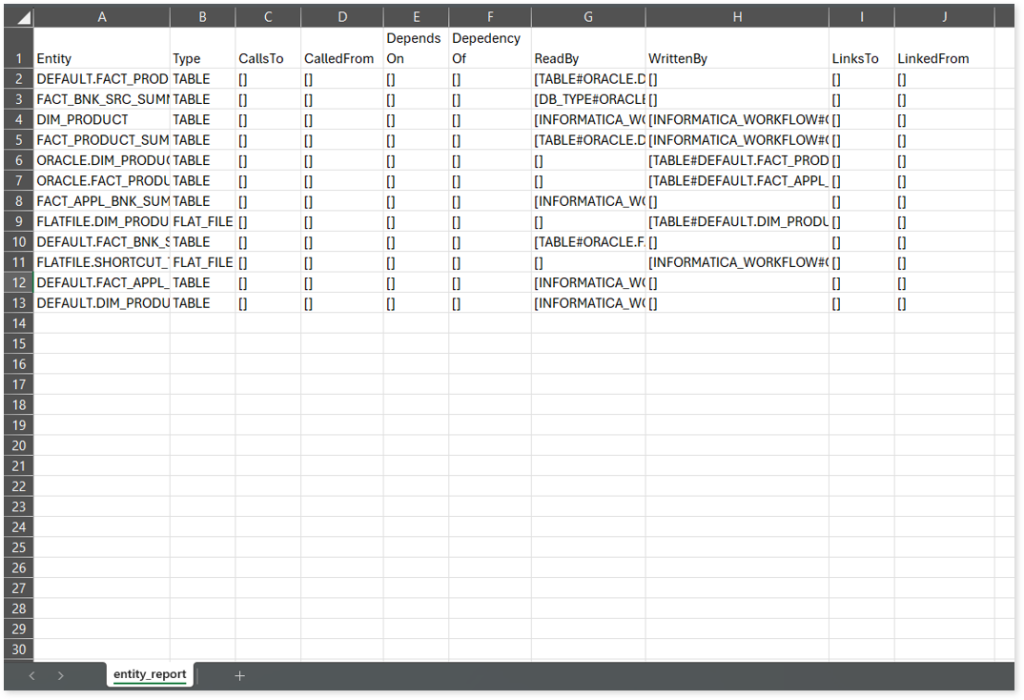 entity_report.csv: This report provides detailed lineage information for each entity within the uploaded source files. It provides a comprehensive list of all entities along with their respective types, identifies the processes or scripts that read from or write to each entity, and includes other dependency details.