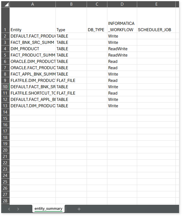 entity_summary.csv: This report provides information about each entity along with the type of relation in which it appears—such as workflow, scheduler job, or database type —and the operation performed in that context, including Read, Write, or ReadWrite.