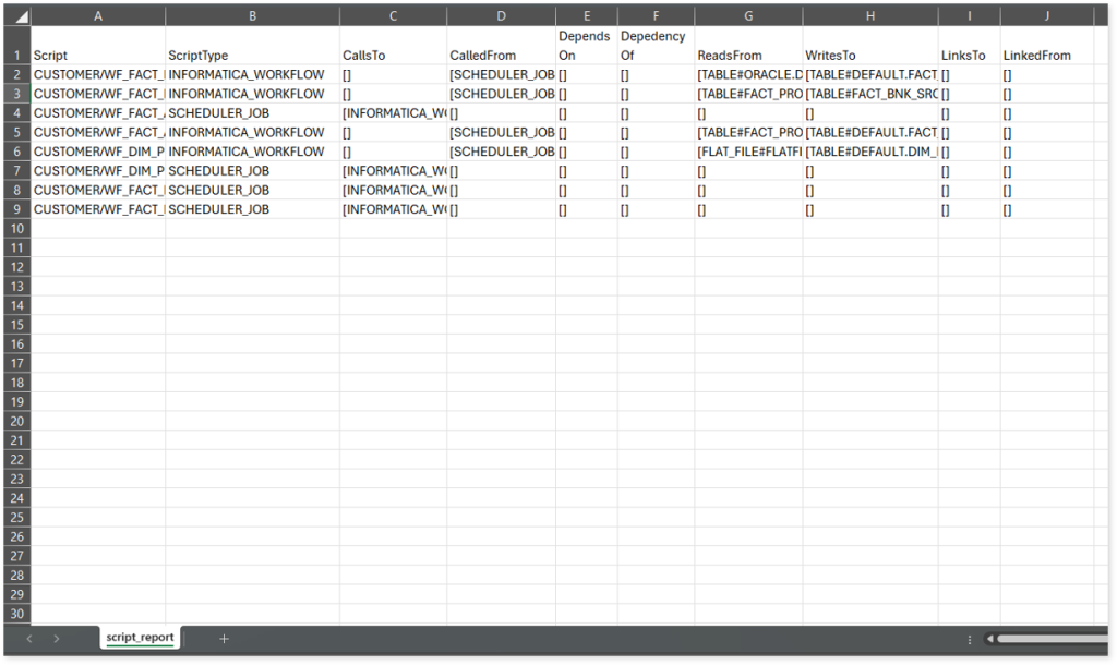 script_report.csv: This report provides detailed lineage information for each script. It lists all scripts along with their types, reads data from or writes data to a process or script, and includes other dependency details.