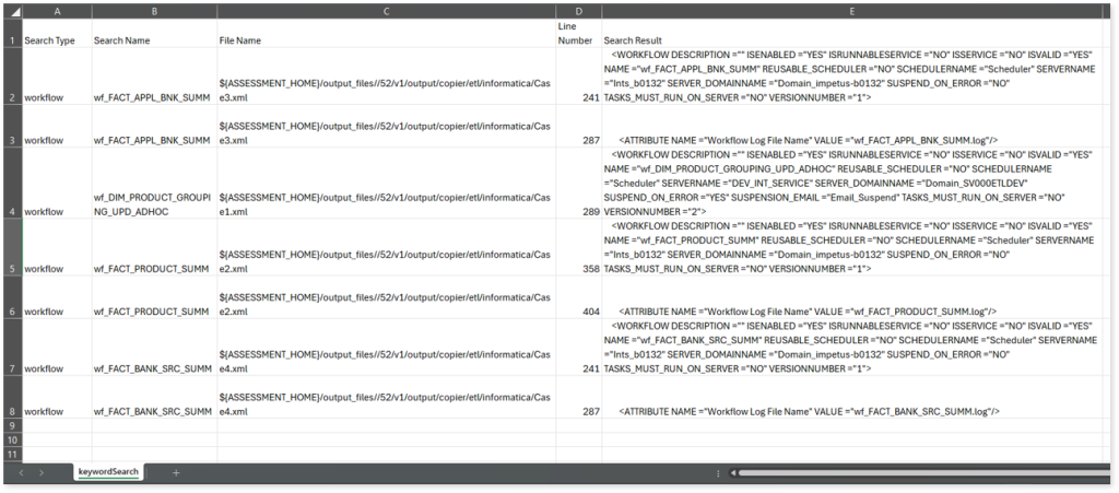 The system dynamically extracts a specific list of keywords (Workflows and Procedures) from the Workflow Summary.csv, informatica_external_procedure.csv, and internal_procedure.csv assessment output reports. These extracted keywords are then used to perform a case-insensitive search across all uploaded artifacts to help you to understand where specific workflows and procedures are referenced.