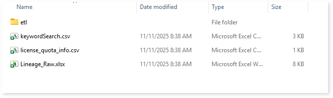 keywordSearch.csv: Provides detailed insights into keyword occurrences— specifically workflows and procedures—identified across all uploaded source files. It captures information such as the search type, the file where the keyword was found, the line number of occurrence, and the actual line content where the keyword appears.