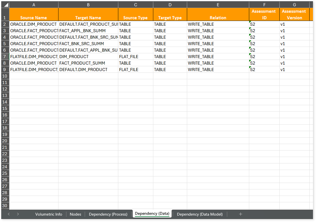 Lineage_Raw.xlsx: This report provides complete dependency details for all nodes. It provides an end-to-end data and process lineage that helps to identify the complete dependency structure and the data flow.