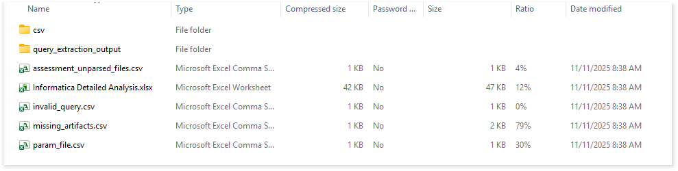 assessment_unparsed_files.csv: This report lists all the unparsed Informatica files along with the reason for parsing failure.