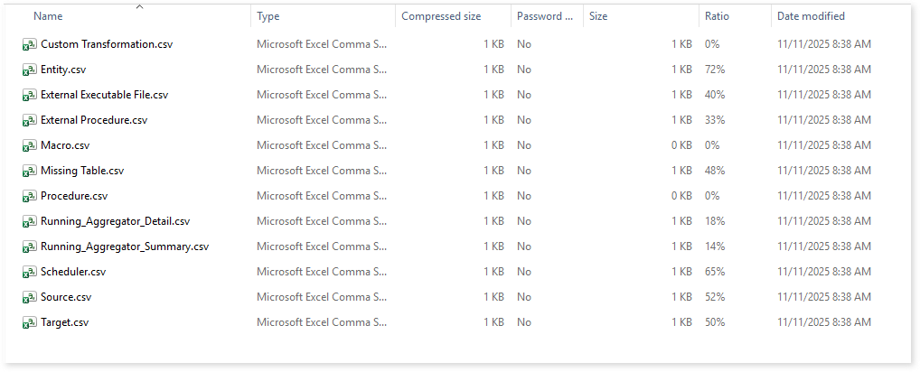 Browse through the csv folder to access reports such as Entity.csv, External Executable File.csv, Macro.csv, Scheduler.csv, Source.csv, Target.csv, and more.
