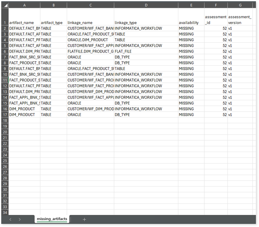 missing_artifacts.csv: This report provides information about missing artifacts, such as tables, along with the associated lineage or node linked to the missing artifact, the lineage type, and other relevant details.